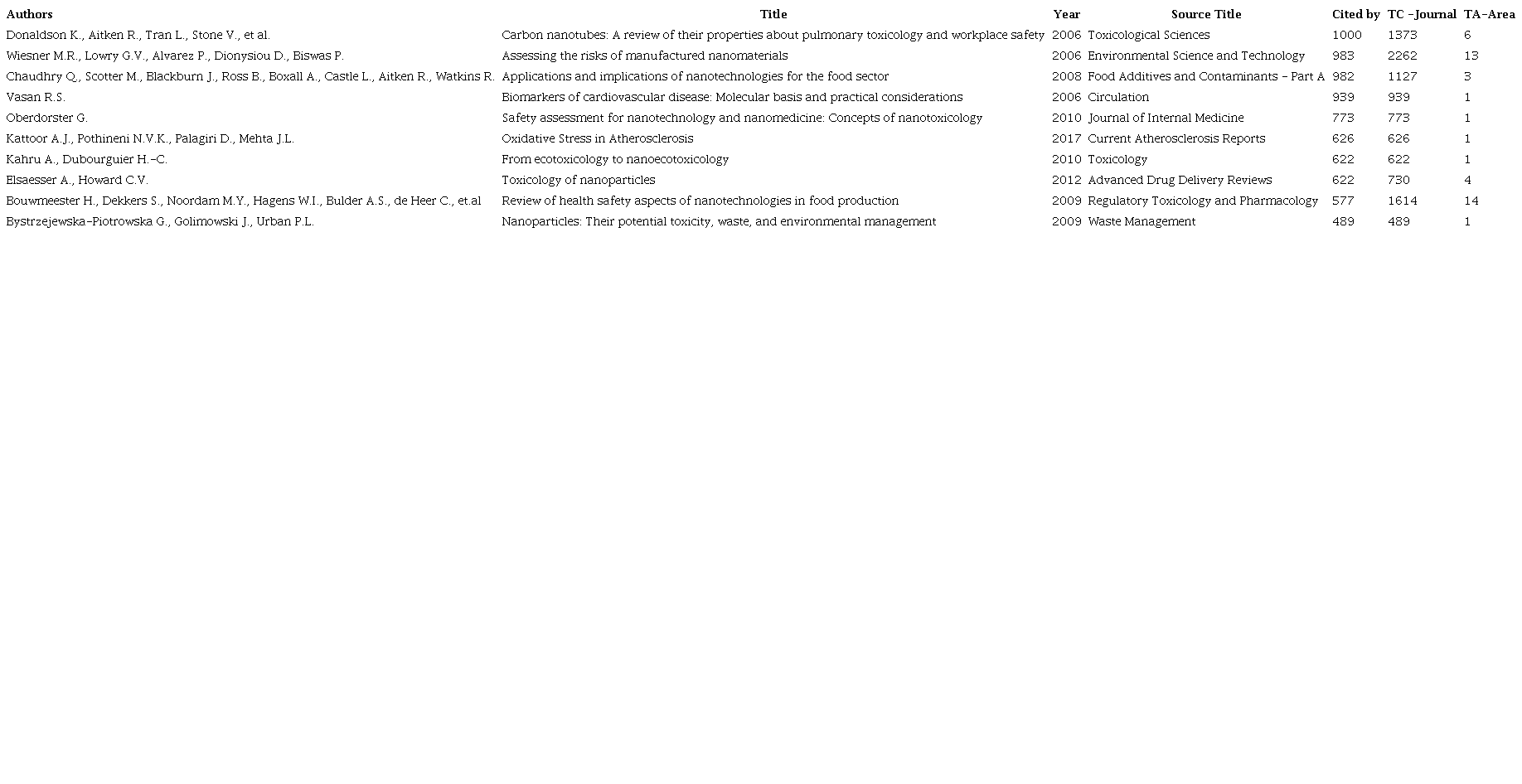 Table 6 presents the top 10 most cited articles on normativity and regulations on nanotechnology. Regarding the most cited articles, these 10 papers accounted for 18.5% of the total citations. They covered topics such as the study of carbon nanotubes and their toxicity levels generated during the manufacturing process of various elements, as well as their adverse effects due to inhalation and the incidence of oxidative stress, which can lead to diseases such as atherosclerosis [39], [46]. Additionally, notable articles focused on the risks involved in the production of nanomaterials, their cytotoxic effects, and their impact on different organs in the body [37], [47]. There were also articles discussing the generation of waste during the production process, as well as its management and disposal [48]. Another highly cited topic revolved around nanotechnology in the food sector, including the production of additives, materials in contact with food, and their implications for consumer safety. These articles included risk assessments and investigations on the kinetics of these materials within the body [40], [49], [50]