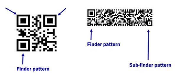 Figure 1 shows how the rMQR Code saves space by reducing the number of eye-shaped "finder patterns" from three to one and a half. This reduction in finder patterns contributes to a more compact design.