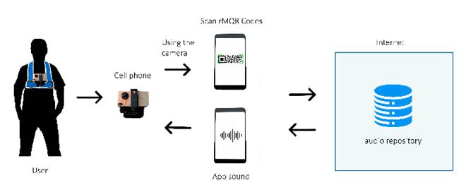 Figure 2 shows a user utilizing their mobile phone to read a code stored in a repository through the internet. Afterward, it plays an audio description of the location. As the user navigates, they point the phone's camera at the code, and the application scans and interprets it.