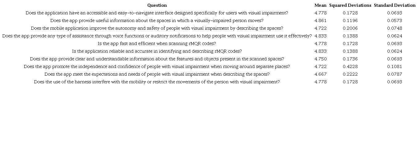 Overall, most participants agree or strongly agree that the application has an accessible and easy-to-navigate interface for users with visual impairment. The mean of all responses is 4.778, indicating an important level of agreement in this area. Additionally, participants expressed a high level of agreement that the application provides useful information about the spaces where a person with visual impairment moves. The mean of all responses is 4.861, reaffirming the effectiveness of the application in providing relevant information. Regarding the improvement in the autonomy and safety of people with visual impairment by describing the spaces, participants showed a positive inclination with a mean of 4.722, indicating a favorable perception towards this functionality of the application.