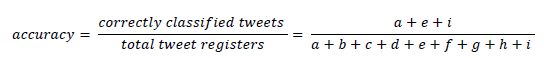 Equation (3) defines the measure of accuracy; the percentage of hits between the records defined by the classifier as belonging to a class and those classified in that class within the evaluated dataset.