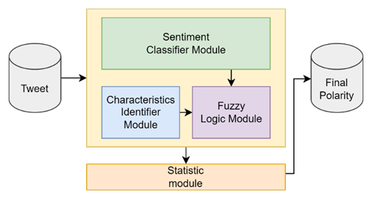 The SentiFuzzy algorithm comprises four modules: Sentiment Classifier, Characteristics Identifier, Fuzzy Logic, and Statistic, as illustrated in Figure 1. Each module is explained below. To calculate the final polarity of a tweet, the polarity and quality assigned by each of the five selected classifiers (Sentiment Classifier Module) are initially defined. Then, from the Characteristics Identifier Module, the characteristics of the tweet are obtained and passed to the Fuzzy Logic Module, which delivers a list of weights that indicates the priority each classifier should have in the tweet. Finally, the Statistic Module defines the algorithm's polarity for the tweet.