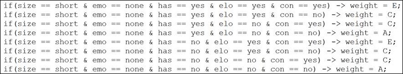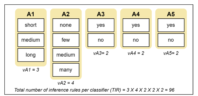A specific set of inference rules was defined for each classifier based on the characteristics or attributes previously identified in Table 3. Equation (1) defines the total number of inference rules per classifier (TIR), where 𝑣𝐴 𝑖 represents the number of possible values that the attribute 𝐴 𝑖 can take.