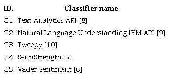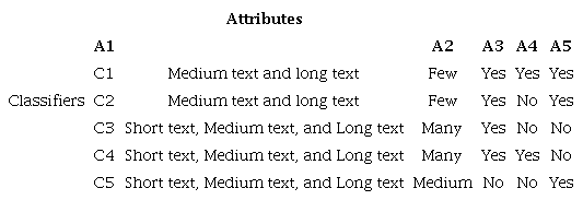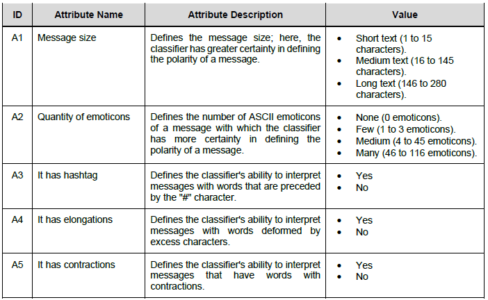 Each sentiment classifier has specific values for these attributes or characteristics, as shown in Table 3. These characteristics can be viewed as strengths or weaknesses of the classifier.