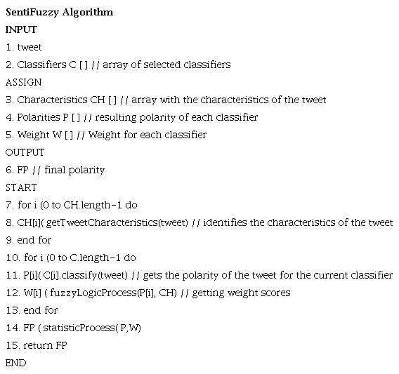 From lines 7 to 9, the CH characteristics vector is filled in according to the read tweet. Through a repetitive structure between lines 10 and 13, the following actions are performed: In line 11, the classify method present in each classifier is called. This method is called directly from the library or API of each selected sentiment classifier. The method receives the tweet as input parameter and returns the polarity, which is finally assigned to the polarity array P. In line 12, the fuzzyLogicProcess method is called, which internally executes the Fuzzy Logic module and allows obtaining the weights of each classifier for the evaluated tweet; these values are assigned to the W array. Next, the statistic module is called in line 14 using the statisticProcess method, which has the weights array W and the polarity array P as input parameters. Finally, the algorithm returns the final polarity FP for the evaluated tweet.