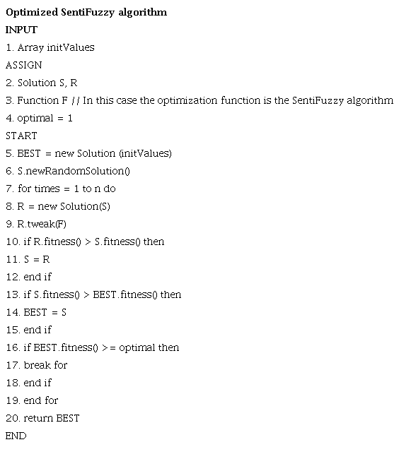 From lines 9 to 21, a repetitive structure that iterates n times is executed, where n is a number previously defined by the user. In line 8, a copy of variable S is made and stored in variable R. In line 9, the variable R calls the method tweak (F), which performs small numeric changes in each array value contained as an attribute in the variable R. The values with the new changes are checked on F, the instance of the SentiFuzzy algorithm. In line 10, it is compared whether the fitness (accuracy of the polarity) of the variable R -to which the changes in the boundary values of the fuzzy sets were made- is greater than the fitness of the variable S -whose boundary values were randomly generated at the beginning or correspond to the best ones defined up to the current iteration-, if the condition is satisfied, then S becomes the value of R.