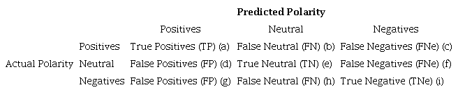 The resulting polarities obtained by the classifiers, including the proposed algorithm, were compared with those stored in the evaluated dataset to obtain the confusion matrix, as shown in Table 6.