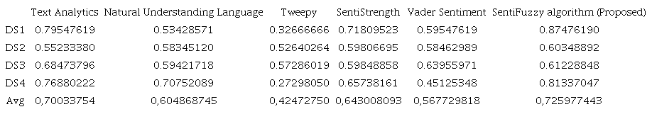 Each sentiment classifier identified in Table 1, along with the optimized SentiFuzzy algorithm, were evaluated using the following datasets: vader_twitter (4200 tweets), sentistrength_twitter (4242 tweets), tweet_semevaltest (6087 tweets), and stanford_tweets (359 tweets), identified as DS1, DS2, DS3, and DS4, respectively. Each dataset was downloaded from the repository indicated [11]. These datasets were selected because the chosen classifiers had previously used them.