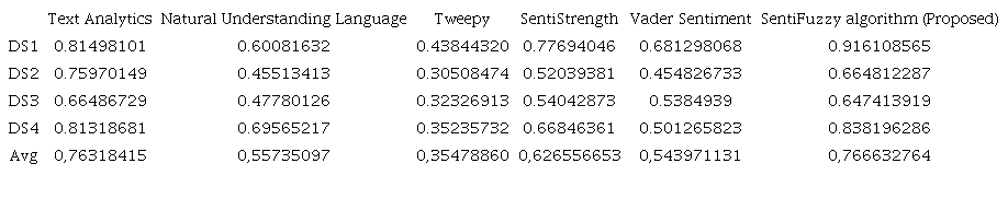 Table 8 shows how the proposed algorithm outperforms measure F1 in two of the four datasets, reaching a high percentage: 92% in DS1 and 84% in DS4. Regarding datasets DS2 and DS3, the results are competitive with the other classifiers. The results of the Friedman test with a statistic of 18.142857 and a P-value of 0.002772592049973266 also show that at least one classifier has values with different distributions. The ranking places SentiFuzzy and Text Analytics (rank 1.5) first, followed by SentiStrength (3.25) and Natural Understanding Language (4.25), then Vader Sentiment (4.5), finally Tweepy (6). Applying Holm's post hoc with 95% significance, we obtain that SentiFuzzy and Text Analytics dominate the results reported by Tweepy, and Text Analytics dominates the results reported by Vader Sentiment.