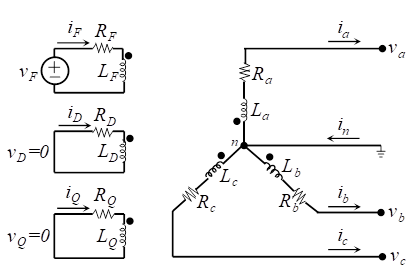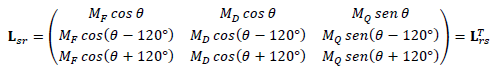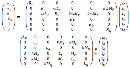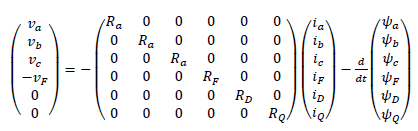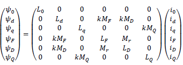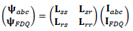the vectors ψabc and ψFDQ consist of the instantaneous values of fluxes in the windings, while Iabc and IFDQ represent the current's instantaneous values in those windings. The subscripts s and r in the inductances L indicate stator and rotor, respectively. The submatrix Lsr contains the mutual inductances between the stator and rotor, and L sr = 𝐋 𝑟𝑠 T .