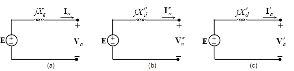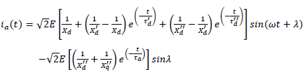 The symmetric component Iac in Figure 4, as described in (12), can be obtained from the model of constant voltage behind impedance with three simplifications: 1) neglecting the saliency and resistances of the armature windings, 2) approximating Ia ≈ Id , and 3) assuming a single voltage 𝐸= 𝐸 𝑞 > 𝐸 𝑞 ′ > 𝐸 𝑞 ′′ which leads to the assumption of constant field voltage.