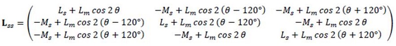 Equation (3) presents Ls as the constant component of La , which does not depend on the angle θ, and Lm as the coefficient of La 's variable component. Lm relies on θ and, therefore, varies with time. The self-inductance for phases b and c account for a 120º offset between the windings concerning phase a. Ms is the constant component of the mutual inductance Lba , independent of θ. By appropriately considering the 120º offset, we can determine Lca and Lbc . Moreover, Lab equals Lba , Lbc equals Lcb , and Lac equals Lca .