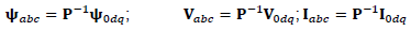 2) Model Structure of the Machine in the DQ Domain. The variables in the stator (phases a, b, and c) can be transformed into new variables with a reference frame moving with the rotor using the "theory of two axes" [22-23]. This theory allows for the transformation of the equations expressed in the static axis abc to the equations in the reference system 0dq, which rotates at a constant speed ωs. If we assume that the rotor speed is constant, and given a balanced system, the transformed equations for the inductances are linear. However, if one of these conditions is not met, the transformed equations become non-linear, and the model must be solved by numerical discretization. Park's work has shown that the variables in the abc axes are related to the variables in the dq axes through the normalized matrix P, given by the following equation.
