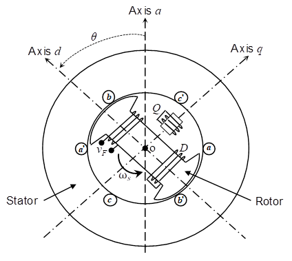 The two parts of a SM's structure are magnetically interdependent. Thus, the formulation of its behavior requires the definition of a coordinate axis of reference. Among the various possibilities for the reference, only two have certain advantages: a) the stator-fixed axis (referred to as abc) in which the main axis aligns with the magnetic axis of phase a, and a d axis coincides with the magnetic axis of the rotor rotating at speed ωs relative to the fixed axis a; b) the rotor-located axes (referred to as 0dq) in which the main axis aligns with the magnetic axis of the field winding, d, but shifted at an angle δ depending on the load so that θ in Figure 1 is ωt+δ+π⁄2 (refer to [15]). Additionally, Figure 1 shows the windings of the SM and the two reference axis systems.