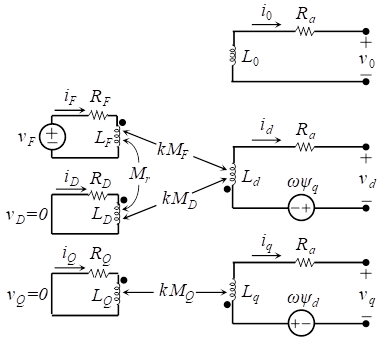 For both types of machines, the magnetic fluxes of the windings in the rotor are independent of the angular position, so all components of Lrr are constants. Nonetheless, there is a flux linkage between the field winding F and the direct axis damper winding D as they share the same axis (Figure 1). Therefore, LFD = LDF = Mr . There is no magnetic coupling between any of the windings in the direct axis (F and D) and the damping winding in the q axis. Consequently, LFQ = LQF = LDQ = LQD = 0.