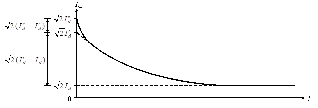 The structure of the model used for the SSC test is called the "constant voltage behind reactance" model. The equivalent network of this model is based on the constant field flux linkage theorem, which is derived from (10), as shown in Chapter 6 of [15]. The theorem's deductions involve approximations that lead to the representation of the SM in its stationary, sub-transient, and transient states using phasor diagrams and equivalent circuits to obtain the constant voltage behind impedance. In this model, when the SSC test occurs at t=0, the effective value of the maximum current is computed based on the envelope, with the dc component subtracted, as shown in Figure 4.