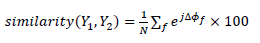 Where 𝑌 1 and 𝑌 2 are the Fourier transforms of the 2 correlated pixels, N represents the total number of frequencies in the signals 𝑌 1 and 𝑌 2 , ∑𝑓 is the sum of all frequencies, while ∆ 𝜙 𝑓 is the phase difference at frequency f defined according to Equation (3)[23]:
