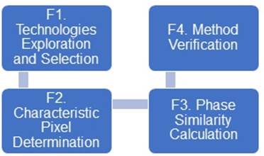 To carry out the present research, we defined four methodological phases: exploring and selecting open-source technologies for hyperspectral image analysis, determining the characteristic or representative pixel of water bodies, calculating the Fourier phase similarity between the representative pixel of water bodies and the 200 selected pixels (100 water body pixels and 100 other material pixels), and verifying the method on a test hyperspectral image (Figure 1).