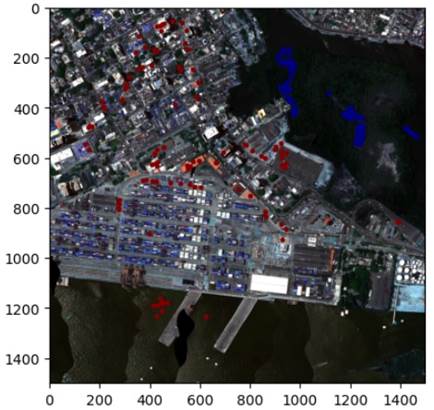 As previously mentioned in the methodology section, the study initially obtained a sample of 100 pixels corresponding to water bodies and 100 pixels of other materials from the hyperspectral test image presented in Figure 2, to evaluate the effectiveness of the method to distinguish water body pixels from other types of pixels. Thus, in Figure 3, the 100 sample pixels selected for water bodies are drawn on the test image in blue, while the 100 sample pixels selected for other types of materials (seawater, roofs, containers, roads, cars, among others) are shown in red.