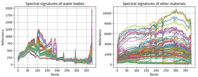 According to Figure 1, in phase 1 of the methodology, a set of Python language libraries was selected to analyze and process hyperspectral images, including Spectral, NumPy, and Matplotlib. The Spectral library was used to read and process different bands or layers used in the study. The NumPy library was employed to determine the Fourier phase similarity between pixels. Finally, the Matplotlib library was used to generate graphs corresponding to the spectral signatures of bodies of water and other sample materials.
