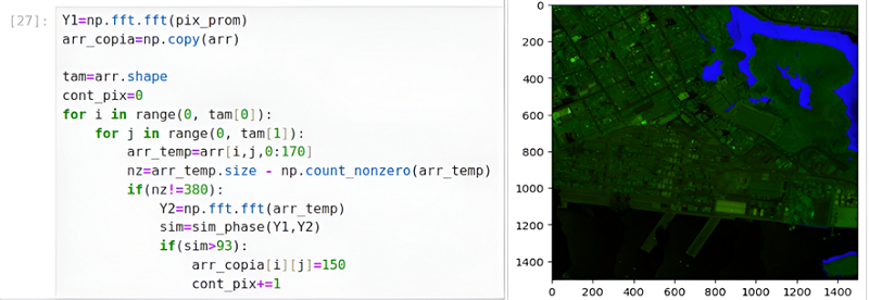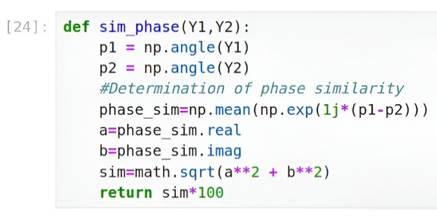 Based on the characteristic pixel presented in Figure 4, it is possible to calculate the phase similarity between the average pixel and the 100 sample pixels corresponding to water bodies and other materials by computational implementation of Equations (1)-(3). Thus, Figure 5 presents the implementation of the Fourier phase similarity in the Python language. It is possible to observe that this function receives as parameters the Fast Fourier Transforms (FFT) of the two pixels between which the phase similarity will be calculated, in this case, the characteristic pixel and the sample pixels.