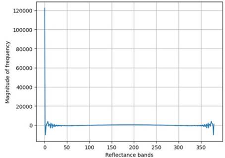 Furthermore, Figure 6 presents the FFT obtained for the characteristic pixel of water bodies: the x-axis shows the different frequency bands considered for each pixel; the y-axis shows the magnitude obtained for the frequency. The function shown in Figure 5 uses this transform as a parameter.