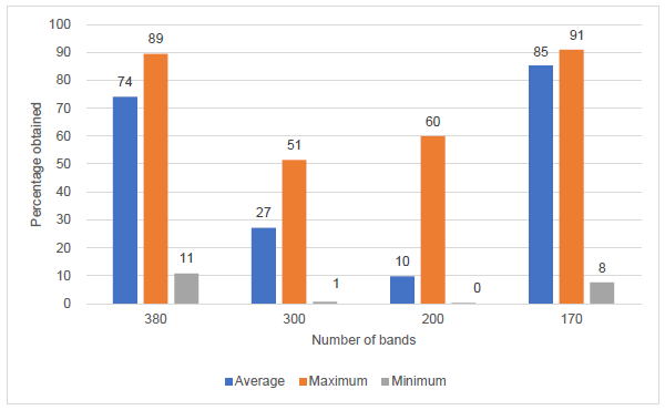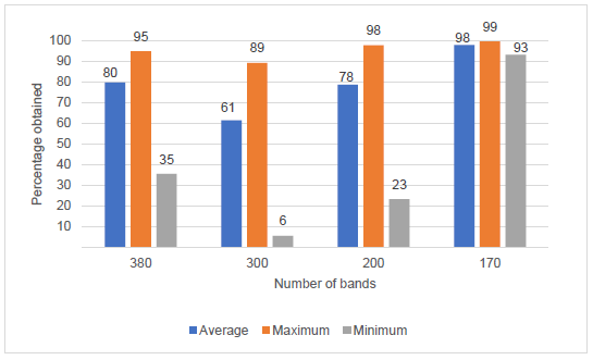 Figure 7 also shows how the best results in the 3 statistical measures (minimum, maximum, and average) were obtained by the group with 170 bands. In all three cases, the similarity values are higher than 93%. In the case of the 200 bands, it is possible to appreciate a good result in the maximum value of similarity with 97.65%. However, the minimum value is 23.25%, so there is a high probability that this similarity overlaps with the similarities calculated for the other material pixels. Likewise, the minimum similarity values of the groups with 380, 300, and 200 bands oscillate between 5.50% and 35.37%, so that the Fourier phase similarity is not considered significant. The results evidence that the shape of the spectral signature presents peaks that differentiate them at the first 170 bands from the other material pixels, which can be seen more clearly in Figure 4.