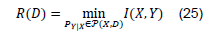 where 𝒫(𝑋,𝐷) is the set of 𝑃𝑌|𝑋 that satisfy 𝔼[𝑑(𝑋,𝑌)]≤𝐷, we obtained the upper bounds on 𝑅(𝐷) by evaluating the mutual information 𝐼(𝑋,𝑌) for a specific 𝑌 and distortion 𝐷. Figure 9 presents the rate-distortion of the proposed mappings in the probabilistic quantizer and the standard Dither quantizer for a standard unit variance scalar Gaussian source. We used the mean square error distortion as measure 𝑑 for each quantizer, guaranteeing that the distribution is on the interval [−𝛥/2,𝛥/2].