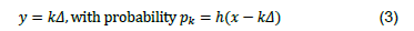 When developing the probabilistic quantizer, we choose a probabilistic mapping 𝑓:ℝ×𝑊→ℤ where {𝑊=ℤ} represents the sample space of a discrete auxiliary variable 𝑤 with alphabet ℤ. As such, the variable 𝑤 can only take values 𝑤𝑘=𝑘∈ℤ with probability 𝑝𝑘=ℎ(𝑥−𝑘𝛥) for certain function ℎ(𝑥). The mapping assigns an index 𝑘 for each input through 𝑓(𝑥,𝑘)=𝑘, and the output of the quantizer is