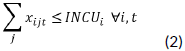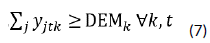 Demand by processing plants: Equation (7) shows that the quantity of broilers to be shipped from broiler farms j to processing plants k at time t must be greater than or equal to the demand by processing plants k.