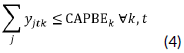 Capacity of the processing plants: Equation (4) shows that the quantity of chickens to be sent from farm j to processing plant k at time t be less than or equal to the capacity of processing plant k.