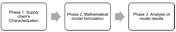 The methodology used for the study is shown in Figure 1. Initially, in Phase 1, a characterization of the broiler chicken supply chain was made; then, in Phase 2, the mathematical model for the network design was formulated; finally, in Phase 3, a detailed analysis of the results obtained after running the model with a real case study was carried out.