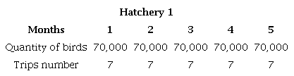 Theestimatedannual cost ofoptimal distributionfor the network is USD$31,230,800. For presentation purposes, only the results of the first five months of the model will be shown. Tables 1 and 2 show that hatchery 1 controls distribution only to farm 3, which has a capacity of 89,000 birds and partially fulfills its capacity, since 70,000 birds are shipped. Therefore, it benefits from the transportation costs and the fulfillment of the client's demand. Similarly, hatchery 2 controls transporting the total capacity of farms 1 and 2, that is 9,500 and 14,000 chicks, respectively, and also sends the amount necessary to complete the capacity of the plant to farm 3, which is equivalent to 89,000 hatchlings.