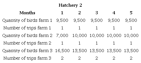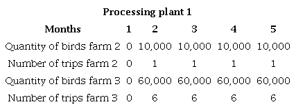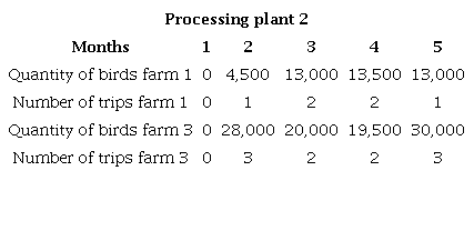 Tables 3 and 4 show that farms 2 and 3 are responsible for sending broiler chickens to processing plant 1, thus meeting its demand for 70,000 chickens. Farms 1 and 3 send the chickens to processing plant 2, farm 2 sends all its production and farm 3 transports what is required to complete the demand for 33,000 chickens by processing plant 2.