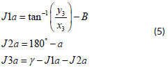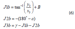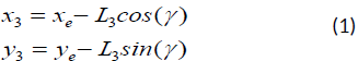The position of the third joint (x3,y3) of each arm is first calculated considering the end-effector orientation (γ) and the length of the third link (L3 ), as described in Equation (1) :