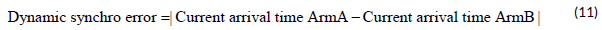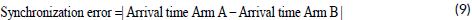 The synchronization error between the two arms is defined as the absolute difference between the calculated arrival times for each arm: