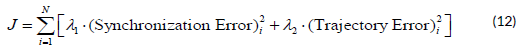 The primary objective of the MPC is to minimize a cost function defined as the weighted sum of the synchronization error and the trajectory error. The cost function J to be minimized is expressed as: