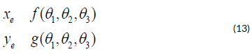The system is modeled based on the direct kinematic equations that relate the joint angles to the end-effector coordinates: