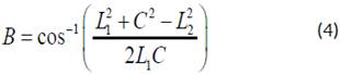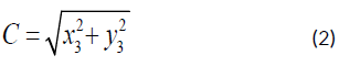 Using these values, the distance C between the base of the arm and the third joint is determined as Equation (2):