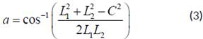 Angle a between links L1 and L2: