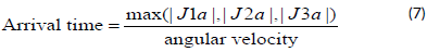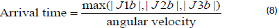 The arrival time for each configuration (elbow-up and elbow-down) is determined by dividing each joint angle by the constant angular velocity of the motors. The maximum time among the joints is considered to define the arrival time for each arm: