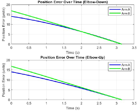 In elbow-up configuration, a similar behavior to the elbow-down configuration is observed, although with a slightly lower synchronization error of 0.67 seconds. This result suggests that the elbow-up configuration offers better synchronization between the two arms. Although Arm B has a higher initial position error than Arm A, the difference in arrival times is less pronounced.