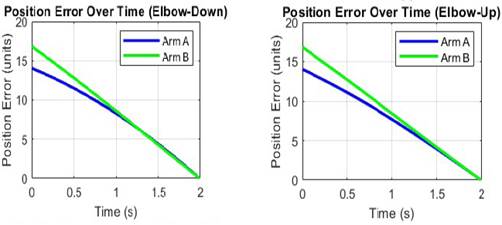 In elbow-down configuration, Arm A shows a lower initial position error compared to Arm B. However, both arms converge to the target within the specified time interval, with Arm A reaching the target before Arm B. The synchronization error in this configuration is approximately 1.15 seconds, thus indicating that the lack of synchronization is a significant factor in this mode.