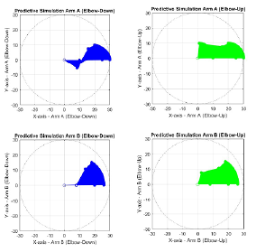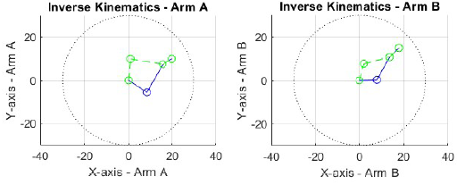 Using these values, two possible joint configurations (elbow-up and elbow-down) for both arms are obtained: