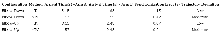 Table 1. summarizes the key results, including arrival times, synchronization errors, and trajectory deviations for both elbow-up and elbow-down configurations, using both IK and MPC methods.