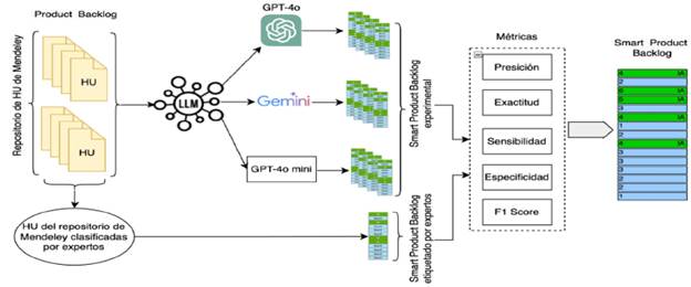 En esta línea, se propuso responder a la siguiente pregunta: ¿Los Modelos de Lenguaje de Gran Escala (LLM) pueden utilizarse en tareas de clasificación automática, sin necesidad de una anotación previa, permitiendo la extracción directa del Smart Product Backlog?, comparando la eficacia de las técnicas de ajuste con los métodos de prompting para esclarecer el potencial de los modelos Chat GPT4o, Gemini Pro-1.5 y GPT4o-Mini.