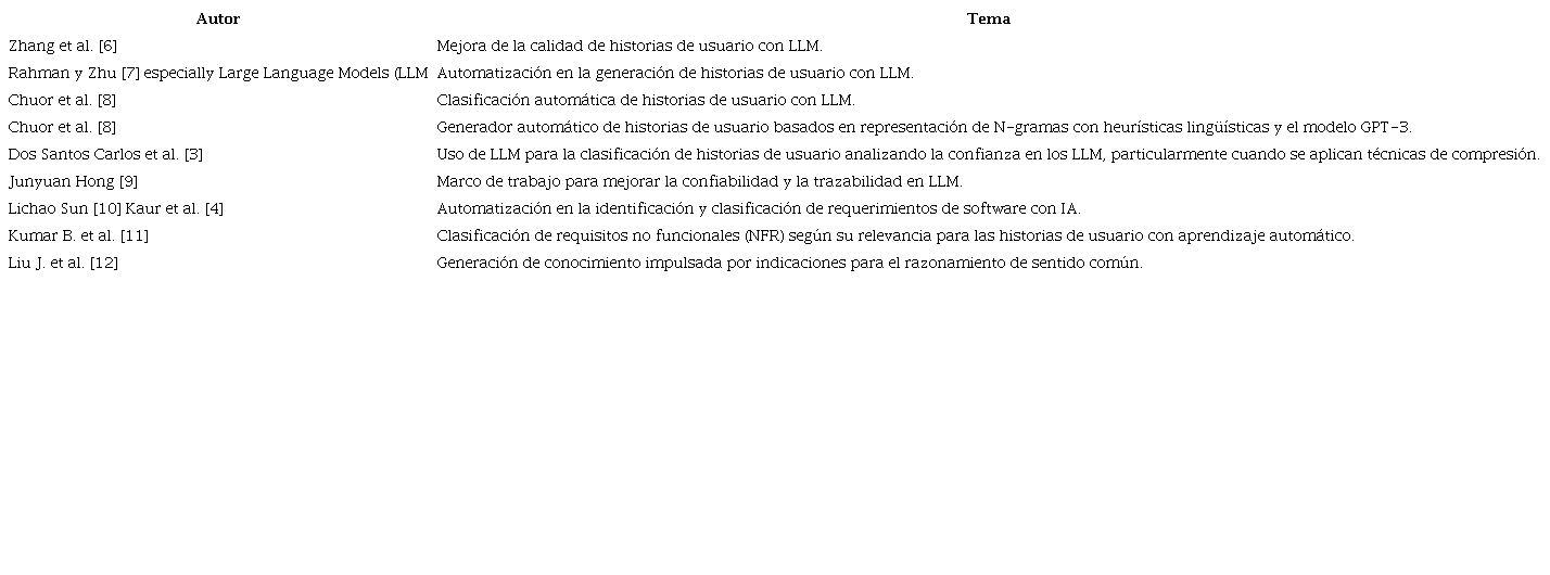 En los últimos años, los LLM han emergido como herramientas poderosas en diversas áreas, incluyendo el desarrollo de software. Este estado del arte revisó las investigaciones recientes que exploraron su potencial para mejorar la calidad de las historias de usuario, la automatización en su generación, su aplicación en contextos de clasificación, redacción y extracción de estas, y la confiabilidad de los modelos (Tabla 1).