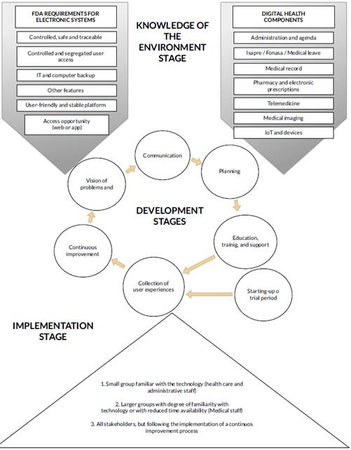 The knowledge stage should be followed by the development stage, emphasizing comprehensive planning, user training, and continuous feedback to ensure seamless integration of electronic medical records. Finally, the implementation stage should involve a phased approach, tailored to user familiarity with technology and the operational demands of different hospital units. This structured methodology ensures that the digital transformation aligns with both regulatory standards and user needs, promoting a successful transition to electronic systems in healthcare.