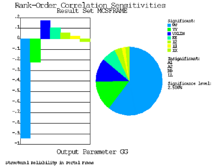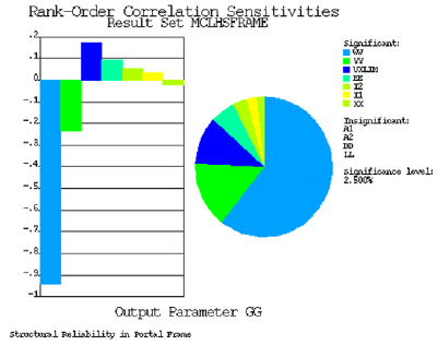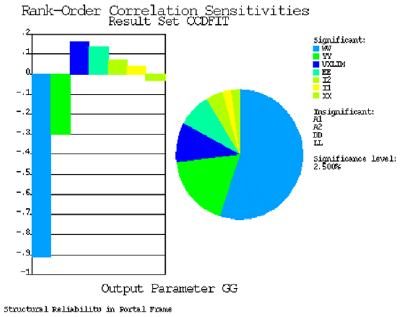 The influence of random variables on the probability of failure of the frame was examined by calculating probabilistic sensitivities. These quantify the impact of each independent variable relative to the other variables. Consequently, the order of significance of the variables was determined as follows: wind load (WW), portal height (YY), horizontal displacement limit (UXLIM), modulus of elasticity (EE), column moments of inertia (I2), beam moment of inertia (I1) and portal beam span (XX).
