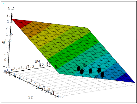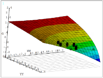 The influence of the two most sensitive variables on the limit state function can be seen in Figures 14 and 15. Figure 14 displays the response surface for wind load WW using the RSM-QUAX method, while Figure 15 displays the response surface for the height of the portal frame YY using the RSM-LIN method.